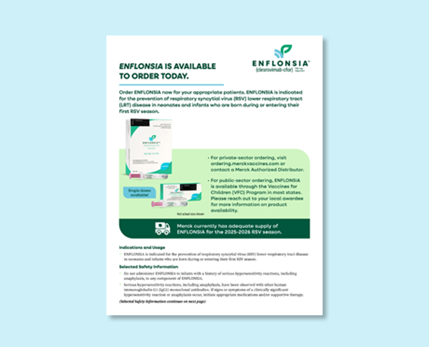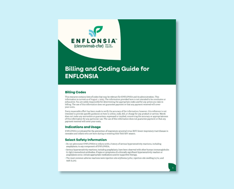 ENFLONSIA is indicated for the prevention of respiratory syncytial virus (RSV) lower respiratory tract disease in neonates and infants who are born during or entering their first RSV season.