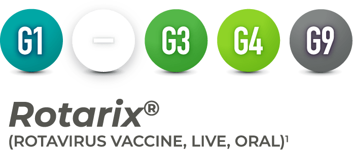 Rotarix is indicated for the prevention of rotavirus gastroenteritis caused by G1 and non-G1 types (G3, G4, and G9) when administered as a 2-dose series. Rotarix is approved for use in infants 6 weeks and up to 24 weeks of age.1
