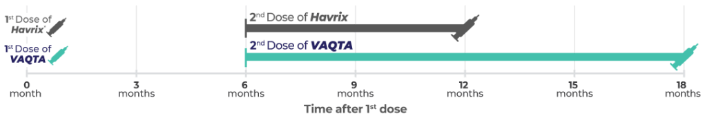 Booster Immunization Following Another Manufacturer’s Hepatitis A Vaccine: A booster dose of VAQTA may be given at 6 to 12 months following a primary dose of Havrix*.